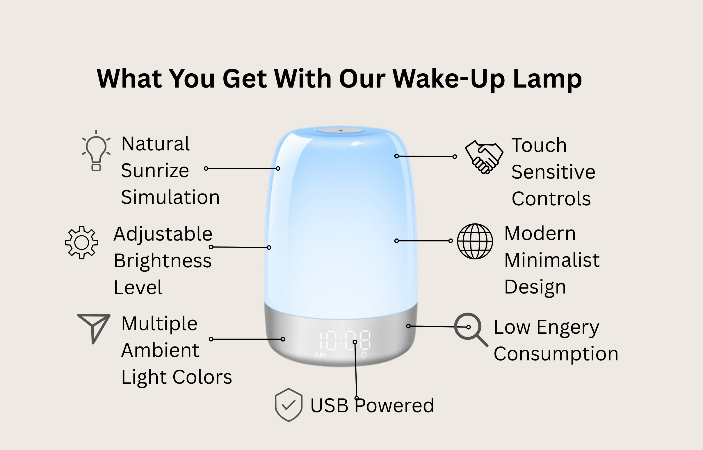 The Wake-Up Sunrise Light uses gradual light simulation to help your body wake naturally — no harsh alarms, no sudden shock to your system.